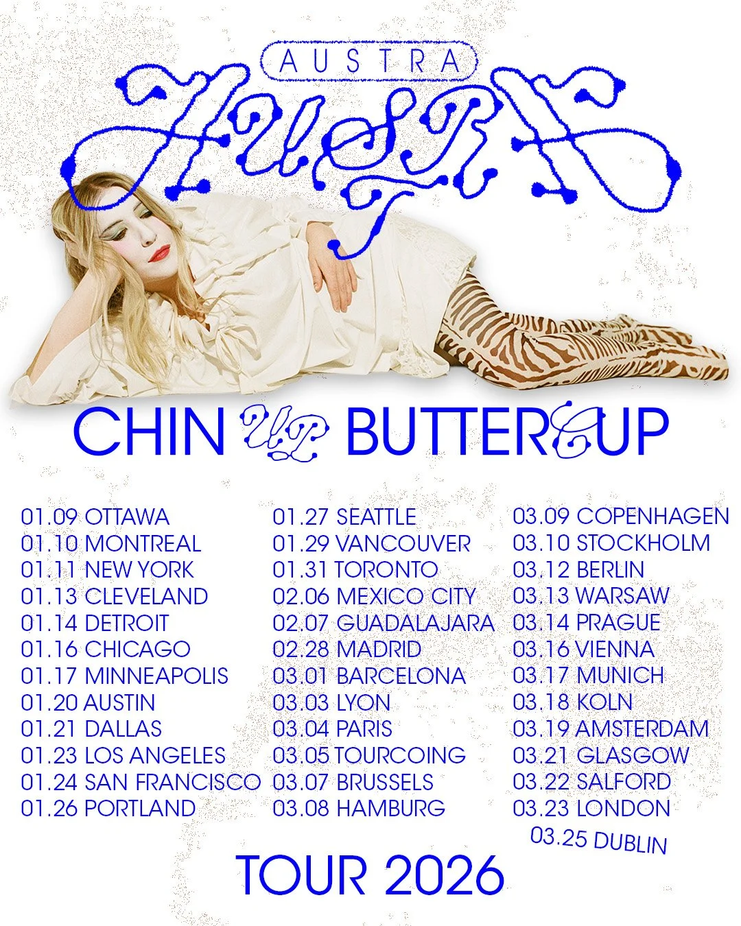 The release of Chin Up Buttercup: The Movie coincides with Austra’s 2026 tour of North America, the EU, and UK, kicking off with three sold-out shows in Ottawa, Montreal, and Brooklyn. Tickets are available at austra.fyi, full dates can be found below.